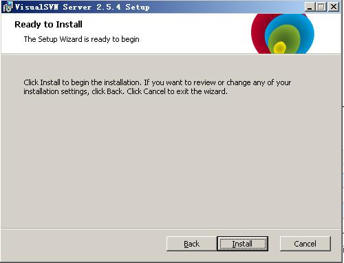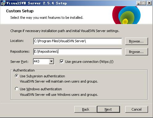 Location是指VisualSVN Server的安装目录,Repositorys是指定你的版本库目录.Server Port指定一个端口,Use secure connection勾山表示使用安全连接,Use Subversion authentication 表示使用Subversion自己的用户认证.点击Next,进入下一步,如图: