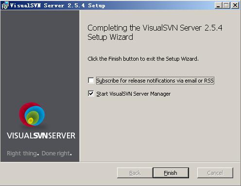 到这里,服务端和客户端都已经安装完毕,下一篇介绍用VisualSVN Server创建版本库,以及TortoiseSVN的使用.