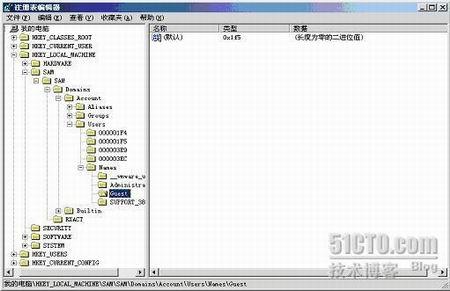 在OS中的用户帐号无论是内置帐号,还是后建帐号,在注册表中都能看见。不过有两个帐号大家一定要能够认识,那就是管理员帐号和guest帐号。(如下图)