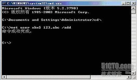 一、先建立隐藏用户 xbx$ 1、net user xbx$ 123,abc /add 这里的意思是说,建立个xbx$ 帐户密码是123,abc(如下图)