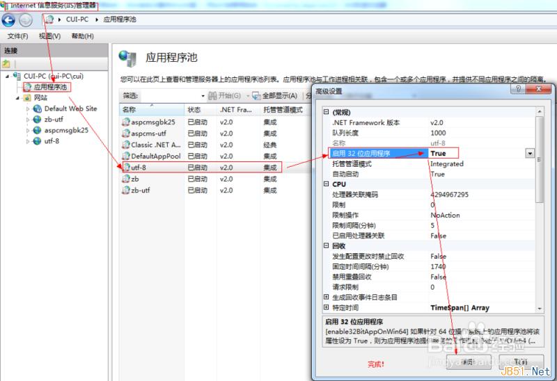 Internet信息服务(IIS)管理器 - ‘应用程序池' - 右边操作中选择‘设置应用程序池默认设置..',在‘常规'中设置‘启用 32 位程序'为True。如下图: