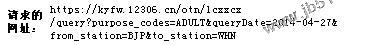 前面是处理请求的地址,后面接的参数purpose_codes是指成人票(AADULT),学生票(自己去试试吧),queryDate就是日期,from_station和to_station顾名思义就是出发站和到达站了。这里北京和武汉分别表示为BJP和WHN。