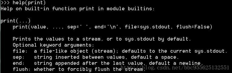首先我们通过help(print)命令来查看print函数的相关信息,(注意在python2中print不是函数,不能通过help获得相关信息)。