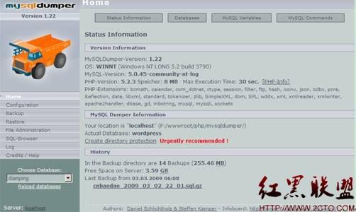MySQLDumper使用PHP开发的MySQL数据库备份恢复程序,解决了使用PHP进行大数据库备份和恢复的问题,数百兆的数据库都可以方便的备份恢复,不用担心网速太慢导致中间中断的问题,非常方便易用。这个软件是德国人开发的,还没有中文语言包。