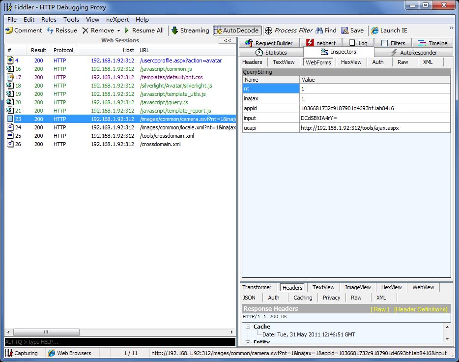在首次到达头像修改界面的时候访问了/images/common/camera.swf?nt=1&inajax=1&appid=1036681732c9187901d4693bf1ab8416&input=DCdSBXIA4rY=&ucapi=http%3a%2f%2f192.168.1.92%3a312%2ftools%2fajax.aspx