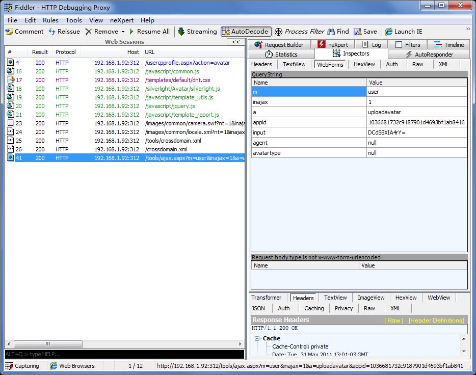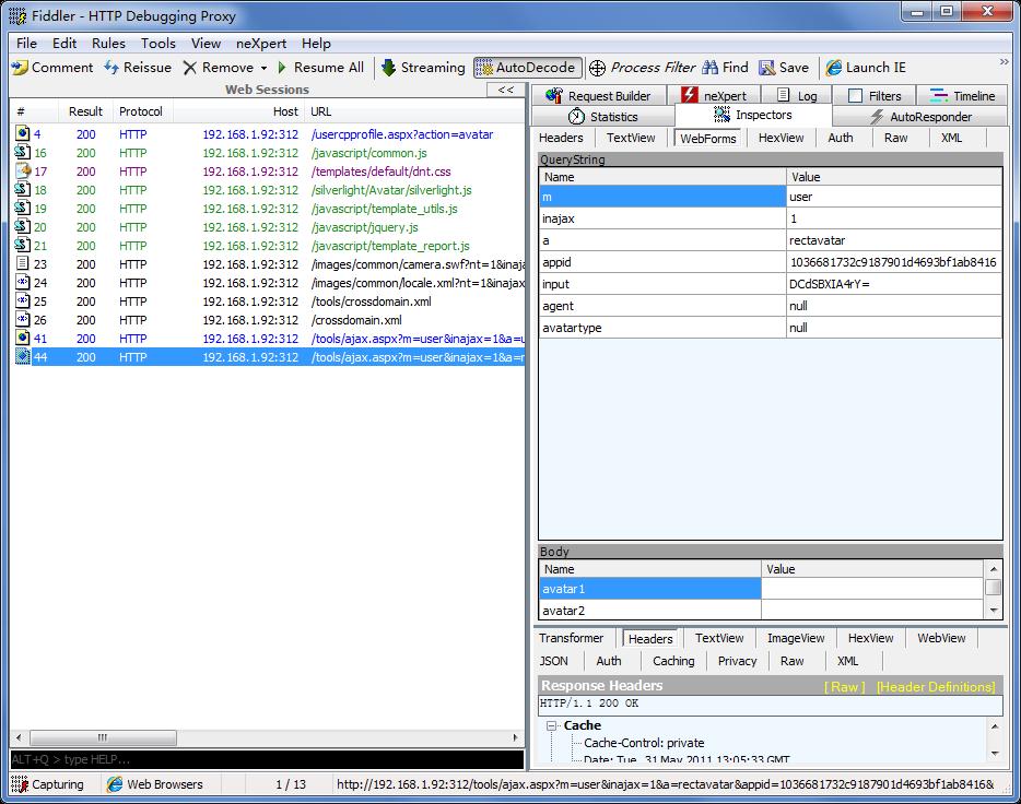 从跟踪可以看到访问路径/tools/ajax.aspx?m=user&inajax=1&a=uploadavatar&appid=1036681732c9187901d4693bf1ab8416&input=DCdSBXIA4rY%3D&agent=null&avatartype=null,它是主要负责处理照片上传的,其中的a参数告诉ajax.aspx执行何种操作(事实上后面我们会发现a为uploadavatar则执行上传操作),input参数同上面一样,是头像图片的名称。
