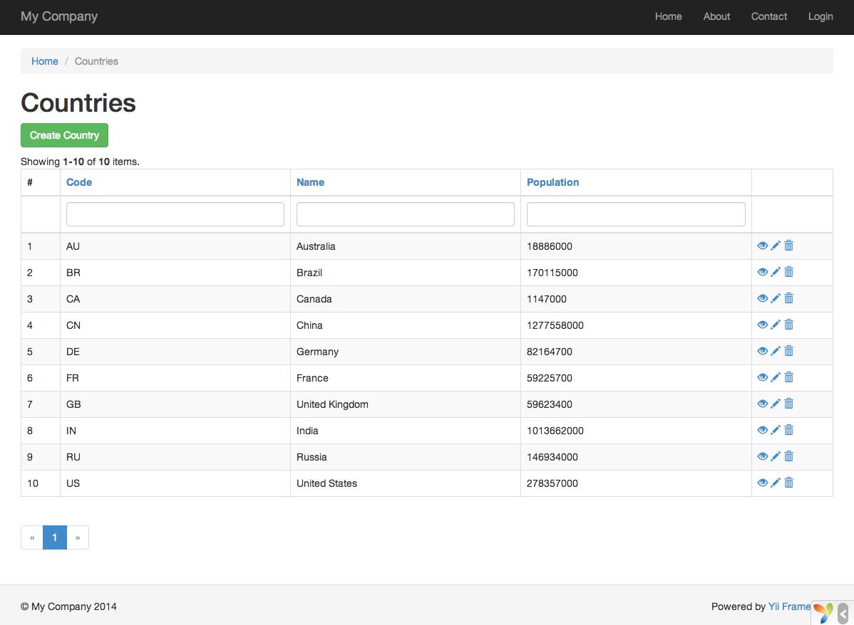 如果你之前创建过 controllers/CountryController.php 和 views/country/index.php 文件(在指南的使用数据库章节), 选中 “overwrite” 下的复选框覆写它们(之前的文件没能全部支持 CRUD)。