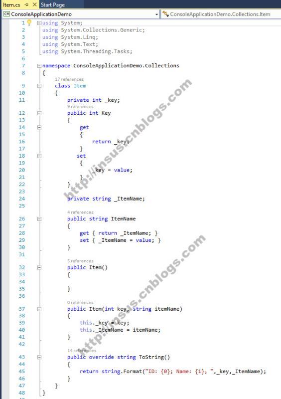 对象,即是网店的商品物件,Insus.NET只为其添加2个属性,物件的ID的Key和名称ItemName以及2个构造函数,最后一个方法是重写ToString()方法。