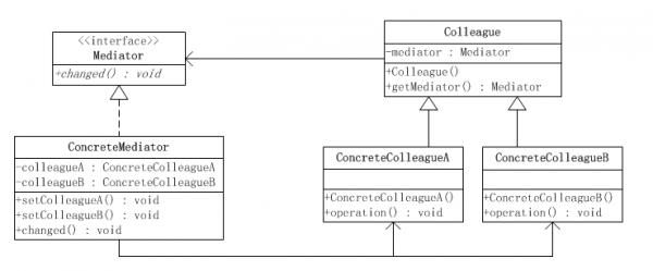 ●抽象同事类(Colleague)角色:定义出调停者到同事对象的接口。同事对象只知道调停者而不知道其余的同事对象。