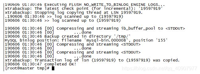 [root@master tmp]# xtrabackup -uroot -pwwwwww --socket=/data/mysql/mysql.sock --no-lock --backup --compress --stream=xbstream --parallel=4 --target-dir=./ | ssh root@192.168.2.192 "xbstream -x -C /data/mysql/ --decompress"