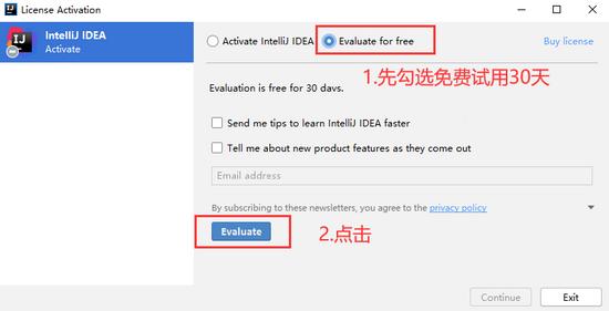 6、 会先弹出一个注册框,勾选 Evaluate for free, 点击 Evaluate: