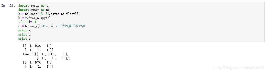 2. Torch的Tensor和numpy的array会共享他们的存储空间,修改一个会导致另外的一个也被修改。