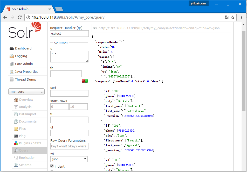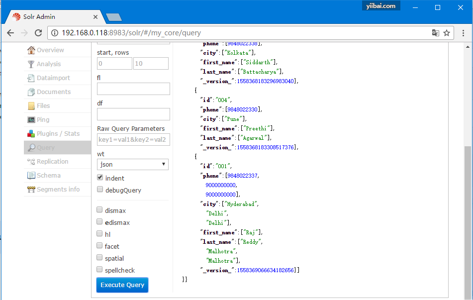 访问Apache Solr Web界面的主页,选择核心 - my_core。 尝试通过在文本区域q中传递查询“:”来检索所有文档,并执行查询。 执行时可以观察到指定的文档(ID为003和005)已删除。