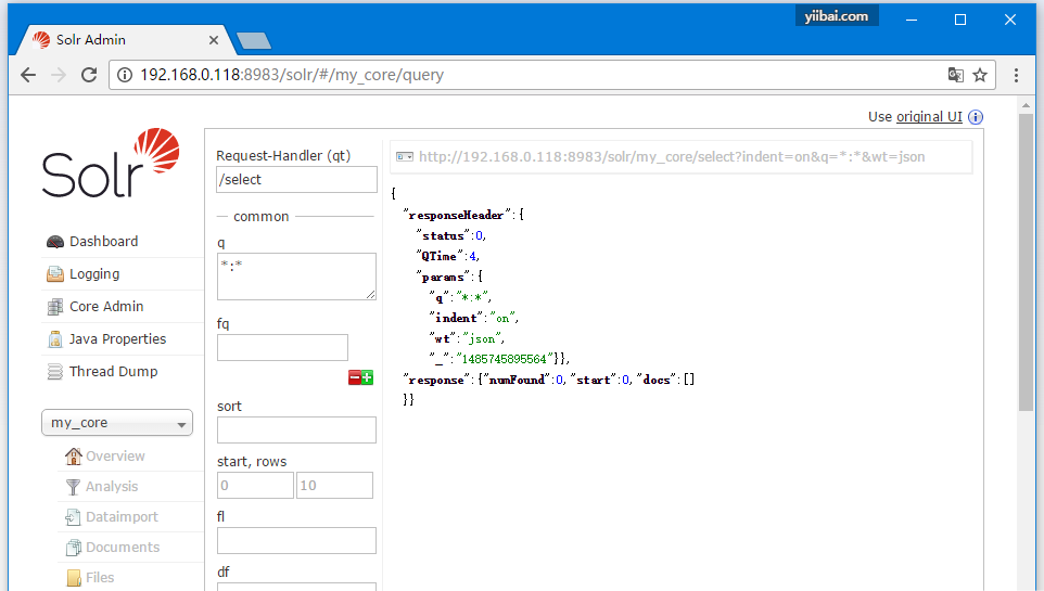 访问Apache Solr Web界面的主页,选择核心 - my_core。 尝试通过在文本区域q中传递查询“:”来检索所有文档,并执行查询。执行时您可以观察到包含指定字段值对的文档全被删除了。