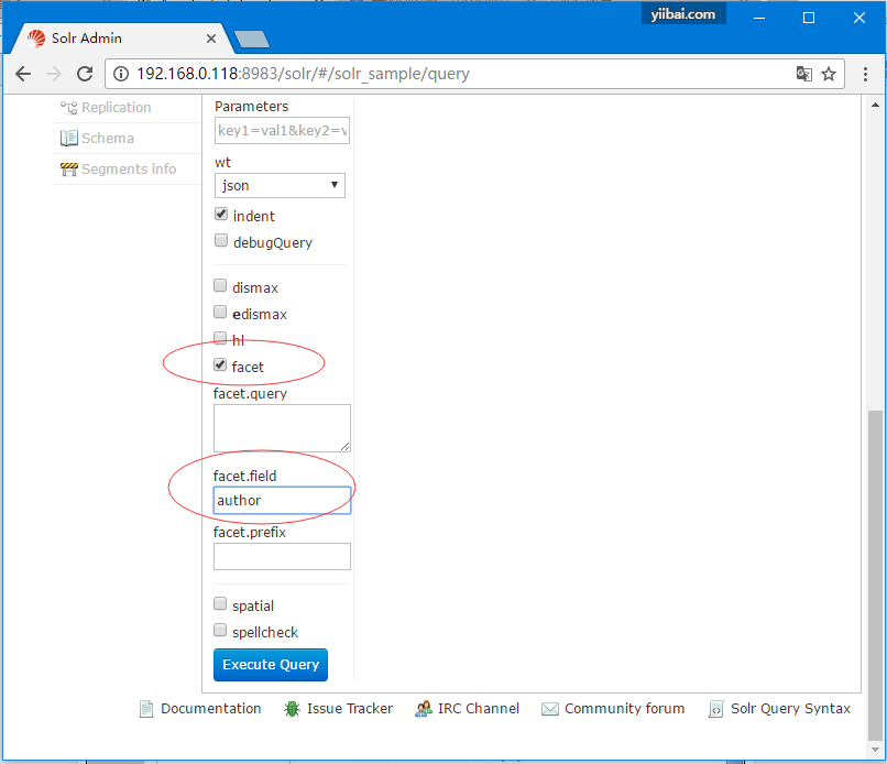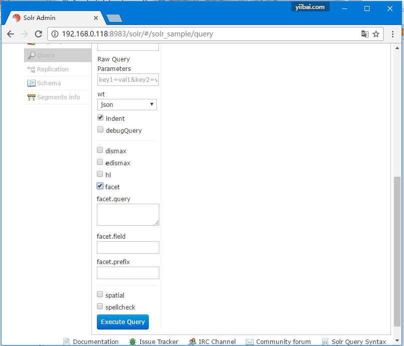 打开Apache Solr的Web UI,在页面的左侧,选中复选框facet,如下面的屏幕截图所示。