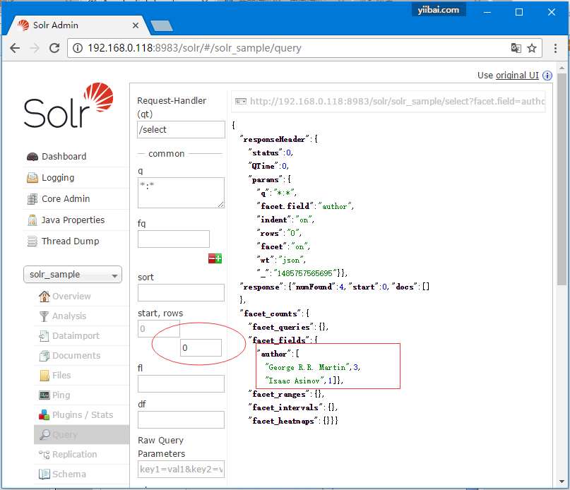 现在对集合或核心:solr_sample上的0行字段author执行一个分面查询。