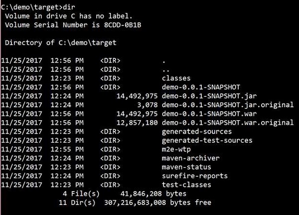 对于Maven,使用命令mvn package打包应用程序。 然后创建WAR文件,可以在目标目录中找到它,如下面给出的屏幕截图所示 -