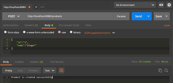 这里,请求URI是/products,它会在将产品存储到HashMap存储库后返回字符串。