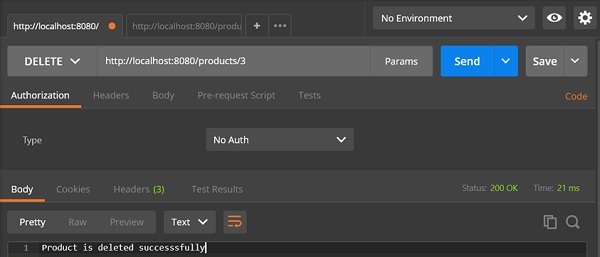 请求URI是/products/{id},它将在从HashMap存储库中删除产品后返回字符串。使用路径变量{id}来定义需要删除的产品ID。